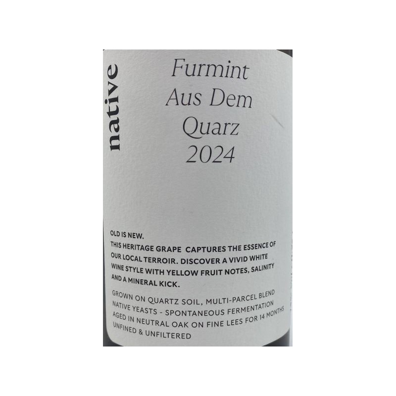 This very fresh furmint comes from several plots of mainly quartz soils with some slate and gneiss. Hence the name of the wine "Aus dem Quarz" - from quartz.
