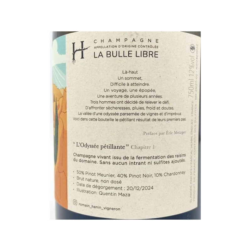 Their first cuvée available to the world is L'Odyssée (2022 vintage base), a blend of Meunier, Pinot Noir and Chardonnay from plots in Aÿ. It is a vibrant, deep and mineral Brut Nature, where fruit and soil prevail over technique. A name to follow closely in the coming years.
