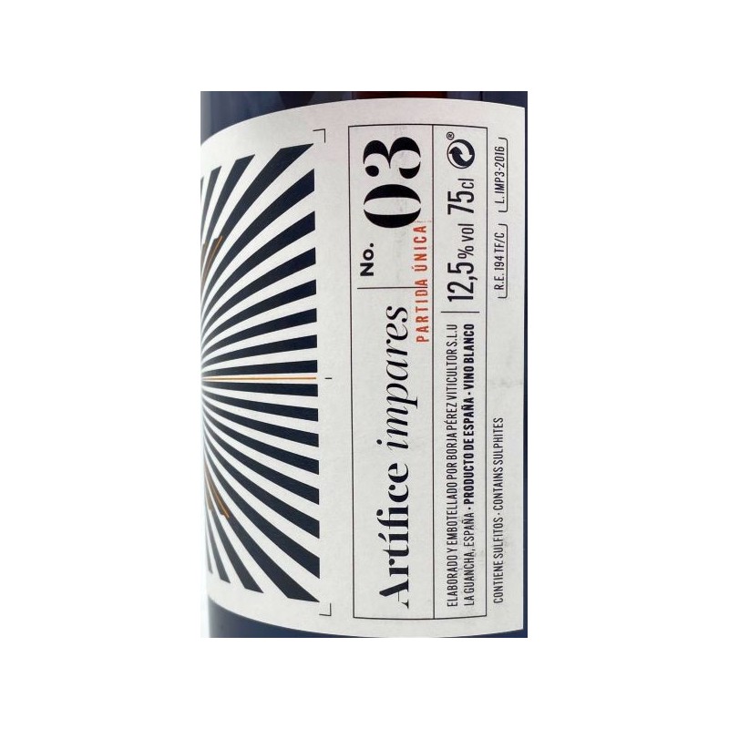 Este vino número 3 (No. 03) está hecho con Listán Blanco proveniente de la Finca el Caramelo, de altura, con las cepas cultivadas en parral alto, tradicional de esta zona. Cosecha de 2016, las uvas maceran y fermentan con sus pieles durante 40 días, posteriormente el vino se afina durante un año en una barrica usada de roble francés de 228 l. No se estabiliza ni clarifica, solamente se filtra suavemente antes de su embotellado.