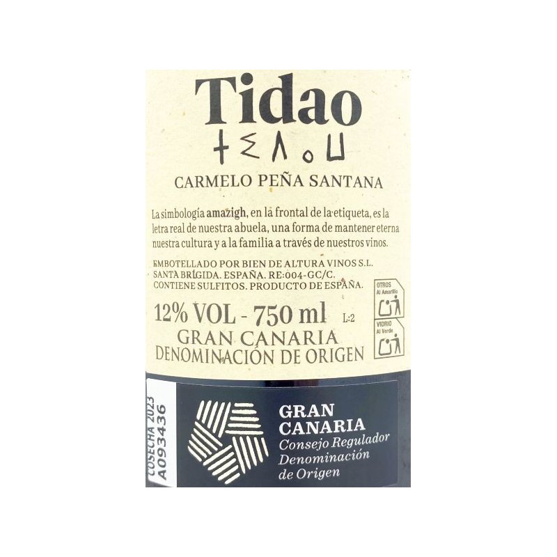 Tidao significa "Unión". Elaborado principalmente con Listán Negro (70%) con el resto de Vijariego Negro, Tintilla y otras. Viñas de más de 110 años, de suelos volcánicos con arcilla, arena y rocas grandes, provenientes de una sola parcela entre 1.100 m de altura.