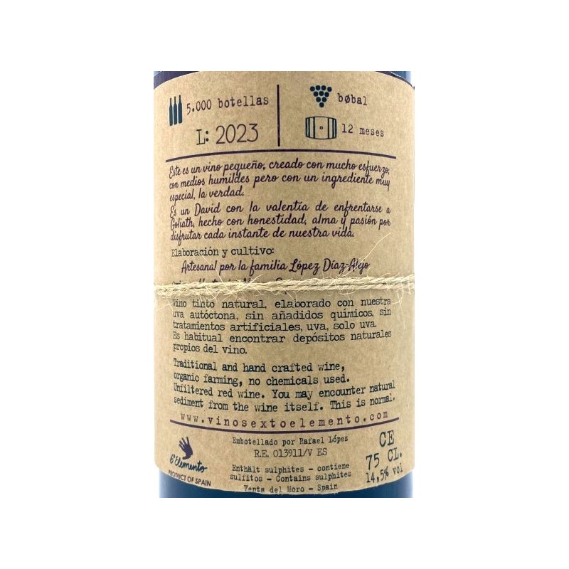 Este David y Goliath está elaborado con la variedad bobal, de forma natural, ya que no se le añade ningún tipo de ingrediente químico.